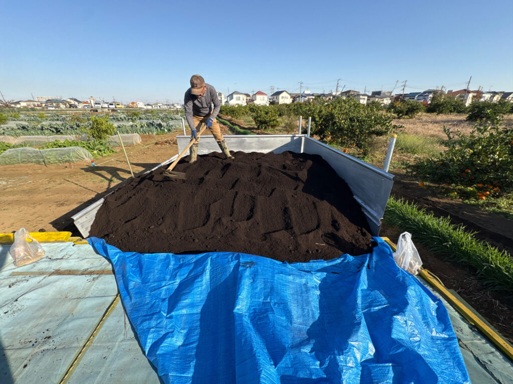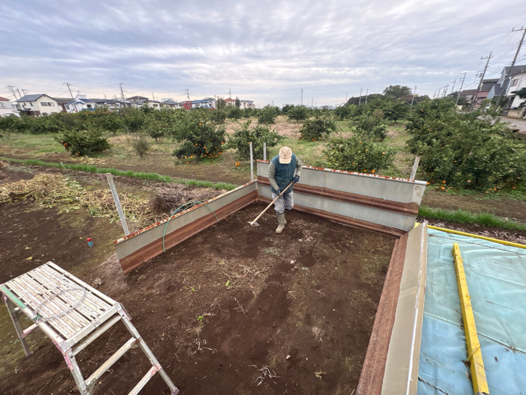 実は、堆肥って4トンで頼んだほうが割安になるので、「じゃあ、大きな置き場を作っちゃおう!」ということで新設を決意。最終的には父がサビ防止にペンキまで塗ってくれて、いい感じに仕上がりました。